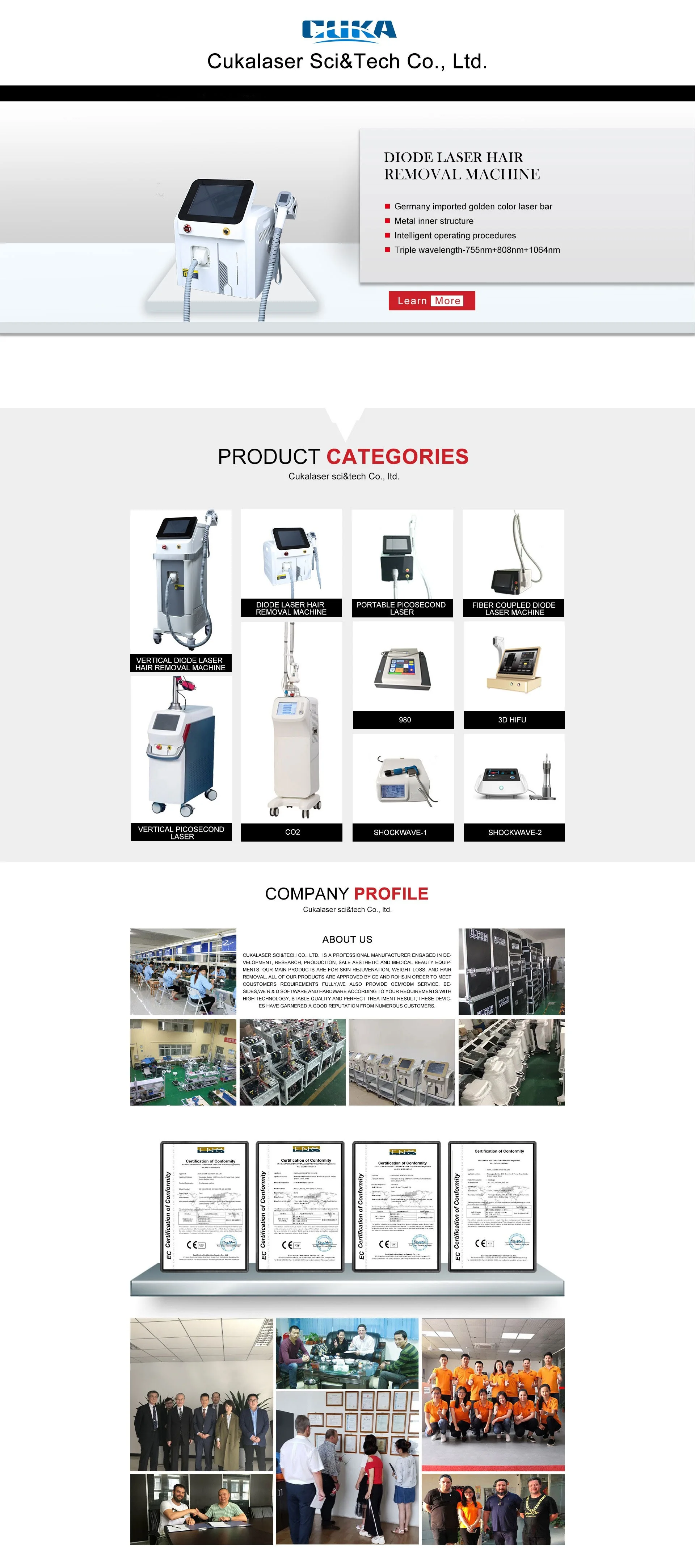 मुख्य उत्पादों: लेजर बालों को हटाने मशीन, डायोड लेजर 980, हिफू मशीन, को2 लेजर, कैविटेशन मशीन
